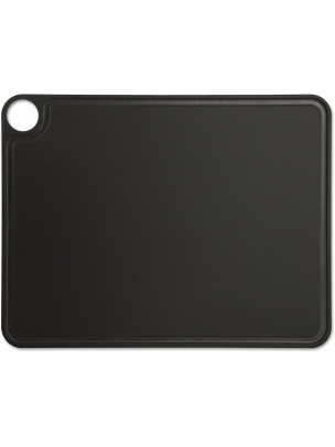 Planche à découper 38x28 cm à pieds avec rigole et poche à jus, en polyéthylène. Epaisseur : 2 cm. NOIR